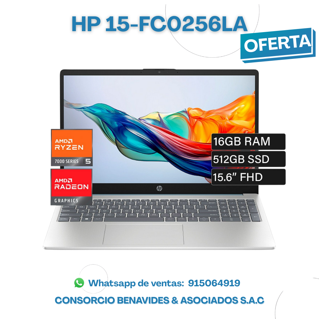 La HP 15-fc0256la es una laptop moderna con procesador AMD Ryzen™ 5 7520U, 16GB de RAM DDR5 (o DDR4 según la fuente, pero rápido) almacenamiento SSD NVMe de 512GB, pantalla 15.6″ Full HD con microborde y antirreflejo, gráficos AMD Radeon integrados, y viene con FreeDOS (sin sistema operativo preinstalado), ofreciendo un buen balance de rendimiento para uso diario, estudio y trabajo, con características como Wi-Fi 6 y diseño ligero.